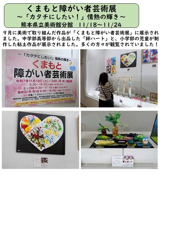 今年度の「にこにこふれあい発表会」は、例年のようなステージ発表ではなく、各学部の活動の映像をDVDにまとめて配付することとなりました。“あしえんから元気を”の全体テーマのもと、高等部では〈元気アート2020〉というテーマで、1学期に取り組んだ園芸と紙漉きを結び付けて、作品作りに取り組みました。牛乳パックから取り出したパルプと1学期に植えた野菜の葉や皮、花を混ぜて漉き液を作り、枠に流し込んで紙を漉いていきました。途中、高等部佐敷分教室の農園芸班のみなさんと映像でのやりとりを行い、野菜の葉や花等、混ぜる素材を提供してもらいました。そして、漉き上がった様々な模様の紙を素材として作品作りを進めました。紙や作品は、学校全体の取組として毎年実施している「アートトレイン」(肥薩おれんじ鉄道様の御協力で、列車内に児童生徒の平面作品を一定期間掲示してもらう取組)に出品したり、今年度直接の交流及び共同学習ができなかった芦北高校農業科のみなさんへのメッセージに利用したり、高等部佐敷分教室のみなさんへの素材提供のお礼のメッセージに利用したりしました。さらに、復旧が終わった後の高等部棟に飾るためのアート作品作りにも取り組み、たくさんの作品が出来上がりました。