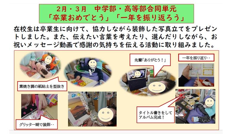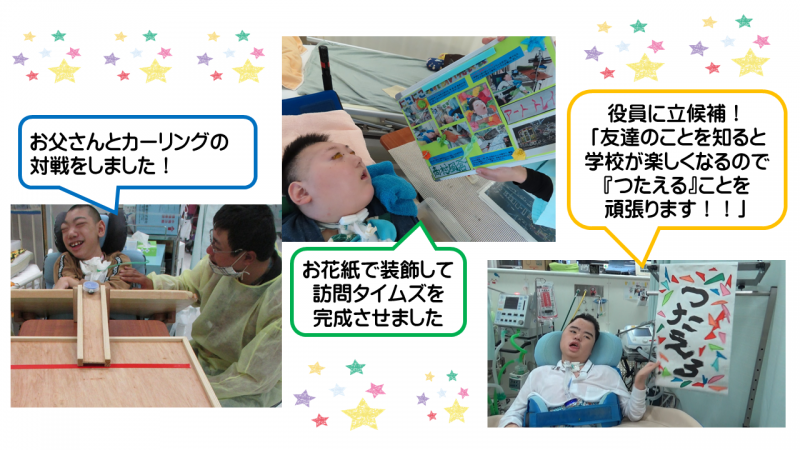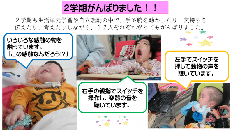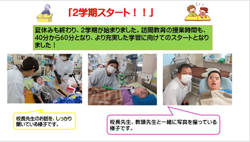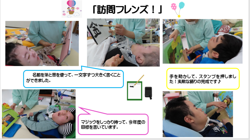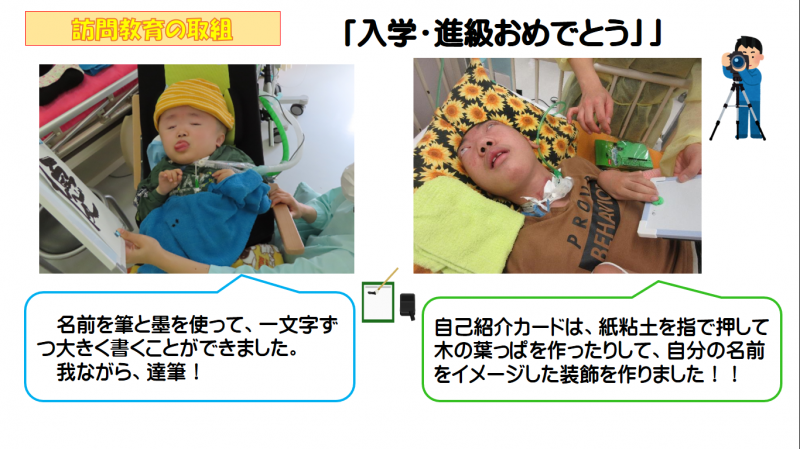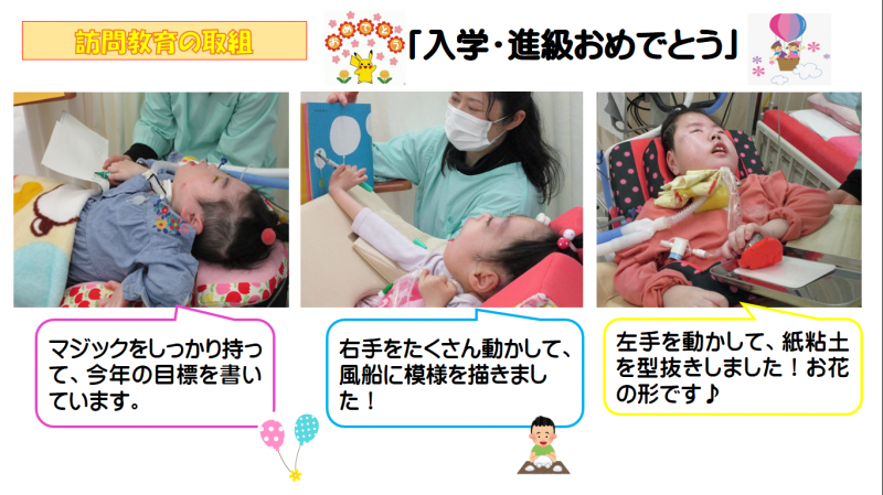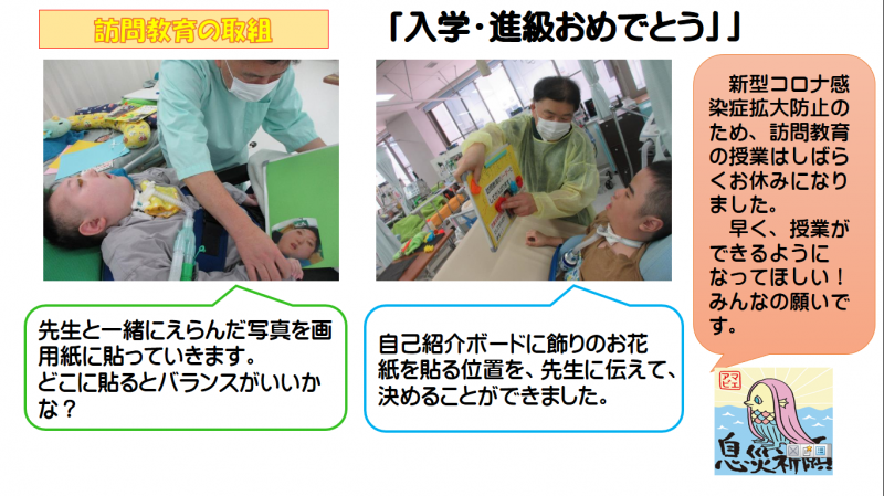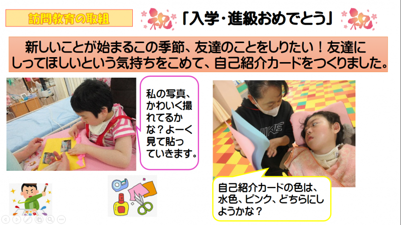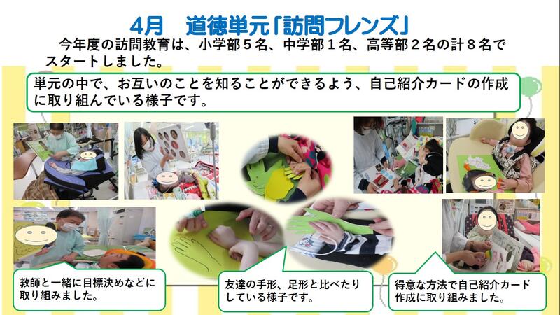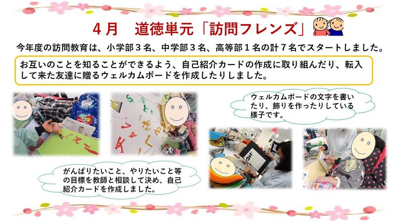 令和3年度の訪問教育は、小学部、高等部に1人ずつ新入生を迎え、小学部6人、中学部2人、高等部2人、計10人で1年間頑張っていきます。