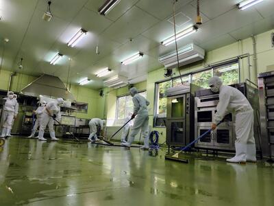 実習台を黙々と磨き上げる者、使用した器具を迷いなく洗浄する者、そして一列になって床を掃き清める者。