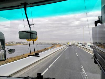 途切れることのない車の波や、すれ違う大型トラックの圧倒的な多さに、生徒たちは窓に釘付けです。