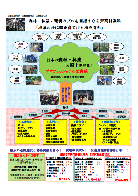| | 国語総合(3) 現代社会(2) 数学Ⅰ(2) 数学Ⅱ(2※1) 化学基礎(2) 体育(2) 保健(1) コミュニケーション英語Ⅱ(2) 家庭総合(2) 英語表現Ⅰ(2 ※1) | 総合実習(2) 森林科学(3) 森林経営(2) 林産物利用(2) 測量(2) 農業情報処理(2 ※1) グリー-ライフ(2※1) ※1 (数学Ⅱ・英語表現Ⅰ)と (農業情報処理・グリー-ライフ)のどちらかを選択 |