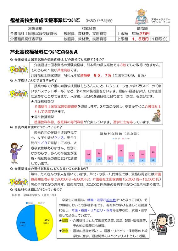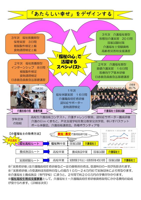 | 2年生から介護福祉類型と福祉教養類型どちらかを選択し専門性を深めます。 1年生の時に福祉の基礎を学び、現場実習も経験した上で どちらの類型に進むかしっかり考えて選ぶことができます。 |