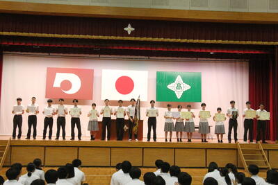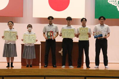 1学期期間中に行われた大会やコンテスト併せて7つ18名の生徒が表彰されました。(団体種目もあるので実際はもっと多いです。)