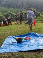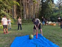 スイカ割りの始まりです目隠しをしてほかの人たちの指示に従ってスイカを割りに行きます