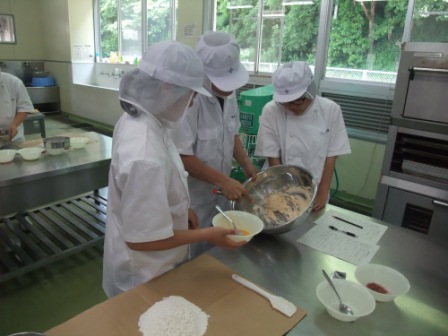 8月1日(木)芦北高校農業科食品実習棟で芦北郡・水俣市教科等研究会中学校理科部会の研修が行われました。研修に当たって、1年農業科の生徒たちが食品製造で学んだパン製造について、中学校の先生方と一緒に製造実習を行いました。参加された中学校の先生からの質問に対して、生徒たちは緊張しながらも、日ごろの実習で学んだことをしっかり伝えていました