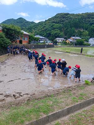 この田植えでは、昨年から、芦北支援学校佐敷分教室の1年生との交流学習も行っています。