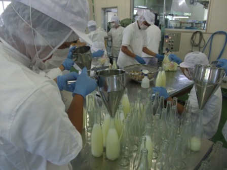 糖度60度に仕上げます。殺菌したビンに詰めて、しっかりフタをします。芦北高校のいちごジャムは果肉を潰さずに丸の