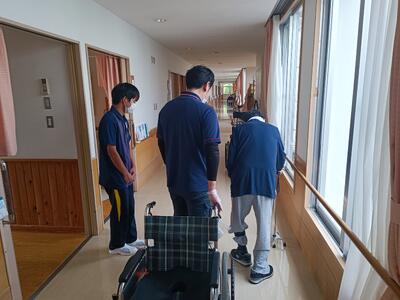 今日は、サービス利用の担当ではありませんが、機能回復訓練の見学をしているところにお邪魔させていただきました。つい手を貸してしまいたくなりますが、そこはぐっとガマンですね。生徒に話を聞くと利用者のために何ができるのかどういった支援がいいのかと考えながら実習に当たっていることが分かりました。