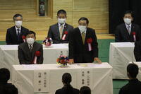生徒代表誓いの言葉では、生徒会長の村上さんが、壇上の丁校長に向けて力強く述べてくれました。コロナや豪雨災害からの復興への想い、支援をいただいた方々への感謝、そして、先輩方から受け継いだ教えや伝統を受け継ぎ次代へ受け継ぐ責務を担っていることなど踏まえた上で、「校訓である『敬愛・勤労・創造』の心を大切に邁進していきます」と宣言されました。
