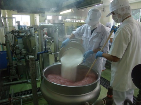 農業科3年生「食品製造」の授業で、二重釜という大きな釜にイチゴとグラニュー糖、ペクチン、クエン酸を加えて煮詰め、