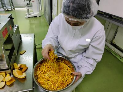 すると機械からは、細長い短冊状にカットされた皮が次々と出てきます。