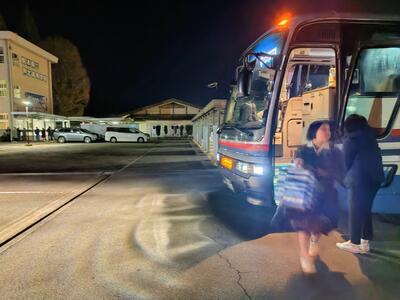 到着時より一段と研ぎ澄まされた空気。吸い込むたびに肺の奥がツンと凍える感覚に、生徒たちは大切そうにお土産の袋を抱え、白い吐息を弾ませてバスへと急ぎます。