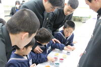生徒が丁寧にサポートしながら、子どもたちが自分で木を磨きました。「ツルツルしてきた!」「木のいい匂いがする!」と、感触や香りの変化に目を輝かせていました。自分のママ、パパの分も作ると2~3個作る園児もいました