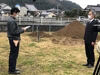 ★農業科を代表して山近くんが校長先生の前で挨拶をしてくれましたこの場所は令和2年豪雨災害でハウス内の樹が2m30cm浸水した場所です