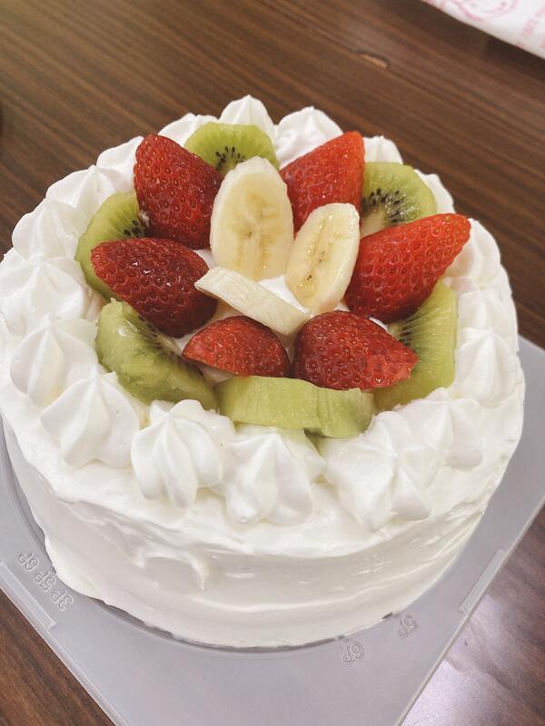 デコレーションは使いたい果物などを各自持って来て、6号サイズ(直径18㎝)を1人1台それぞれの感性で仕上げました。