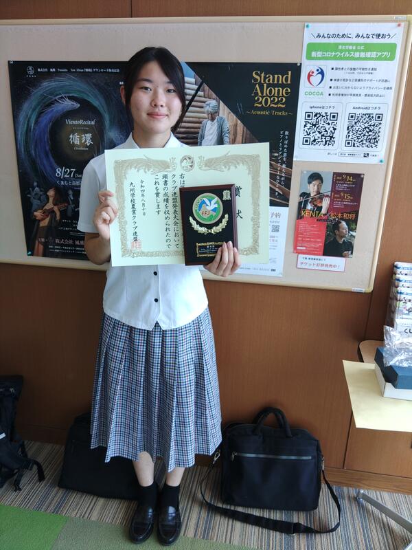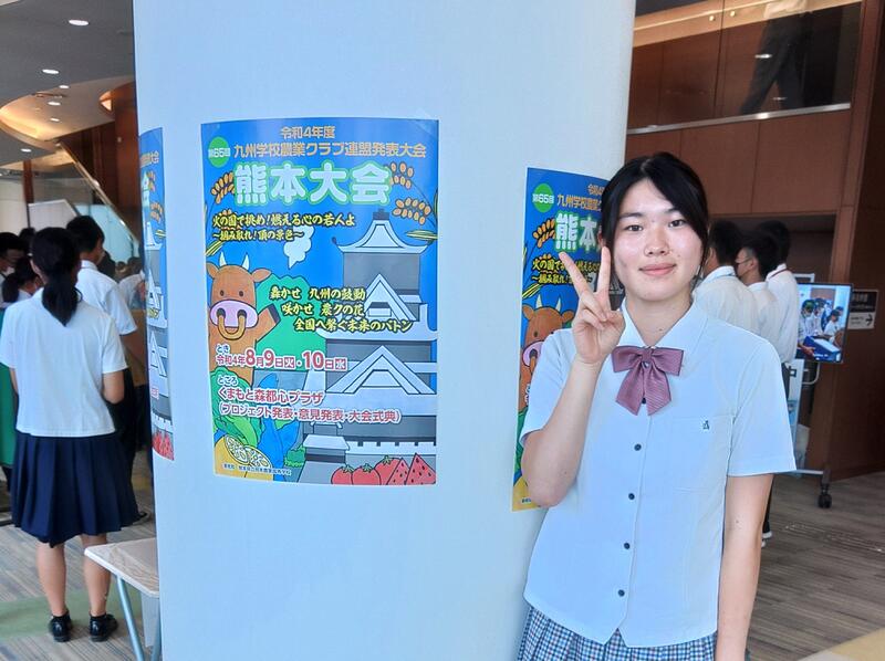 8月8日・9日・10日の3日間で、九州学校農業クラブ連盟発表大会が、熊本市の森都心プラザで開催されました。本校からは、意見発表Ⅰ類の部に3年農業科の高峰さんが出場し、見事、優秀賞に輝くことができました。