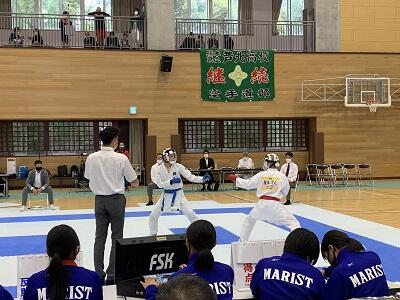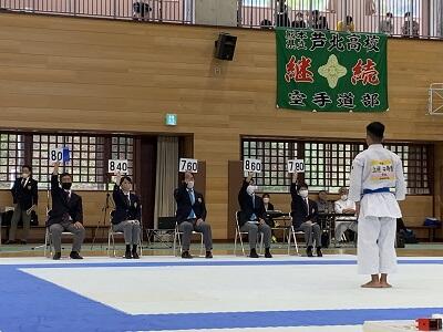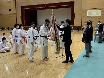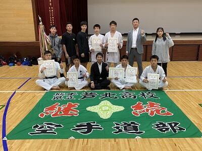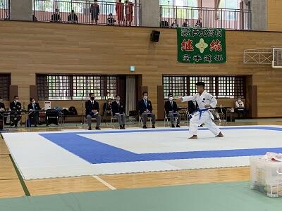 10月8、9日(土・日)、熊本県高等学校空手道新人大会が行われました。夏のインターハイ後、3年生が引退し、1.2年生の6名が参加しました。最初の個人形は、インターハイの悔しさをバネに上村君が頑張り、見事、優勝することができました。