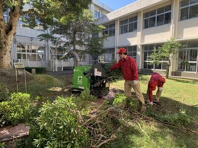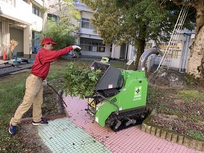 芦北高校には校舎に中庭があり、ヤマモモの木があります。かなり大きく、葉が茂っていたため、剪定を行ったのですが、剪定後はかなりの枝がでてきます。これらを運ぶのは大変ですし、燃やすことはできません。そこで樹木破砕機の登場です。小さいチップに破砕することで、そのままマルチや肥料にすることができます。剪定してすっきりしました。