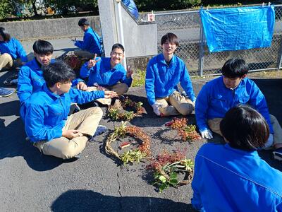 林業科3年は、クリスマスリースを作っているところでした。形も色も様々で、個性が出てますね。実習棟は陰になり寒かったのか日なたに出てきて作業していました。