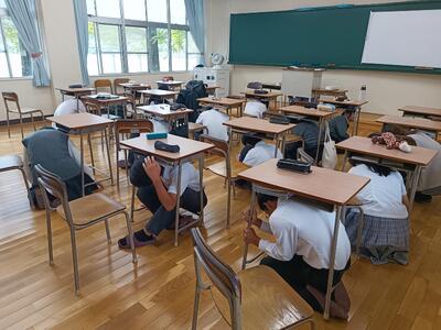 その間に、本日はシェイクアウト訓練も行われました。シェイクアウトとは、地震の際の安全確保行動「まず低く、頭を守り、動かない」を身につける機会です。日頃からの心構えも必要ですね。
