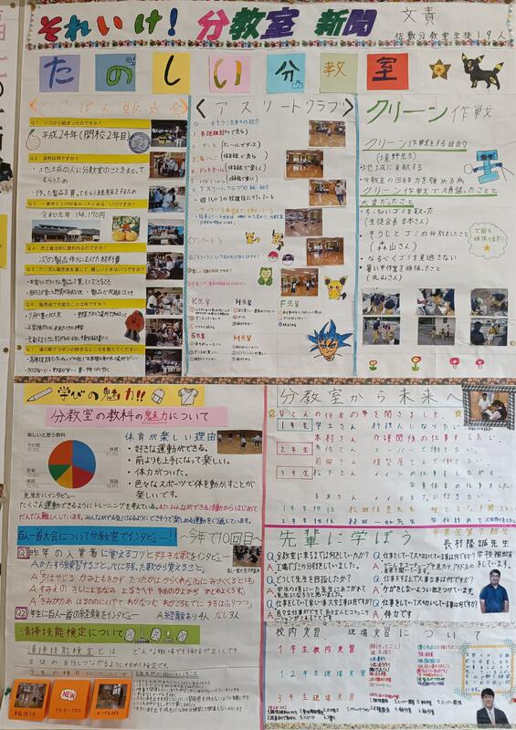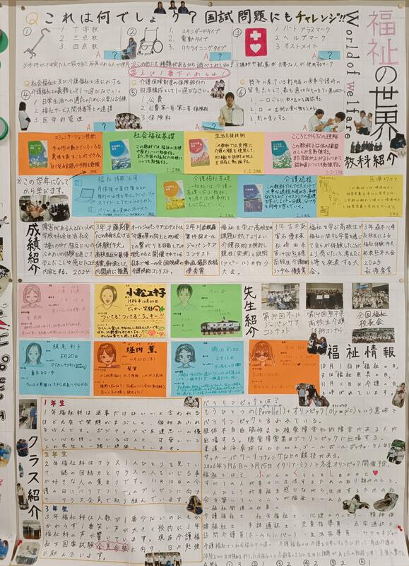 昨年までは、クラス毎に壁新聞を作成していましたが、今年は学科紹介の壁新聞になりました。小さくて何を書いてあるか分からないかもしれませんが、雰囲気だけでもご覧ください。