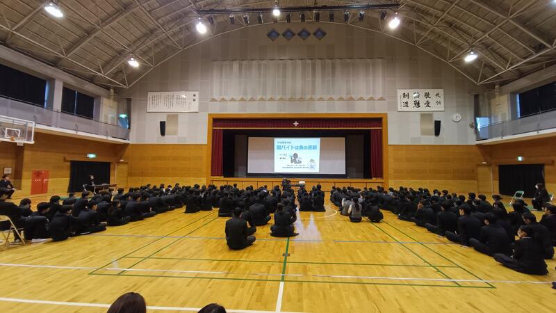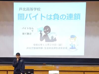本日は、県内でも「闇バイト」に関係する高校生が出てきたことから、芦北警察署の生活安全課よりお越しいただき「闇バイト」の募集の手口や、その危険性などを説明してもらいました。