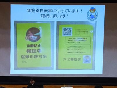 後半は、自転車についての話もありました。芦北警察署管内の自転車盗難が増えており、盗難に遭った自転車はすべて無施錠であったとのことです。