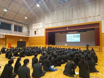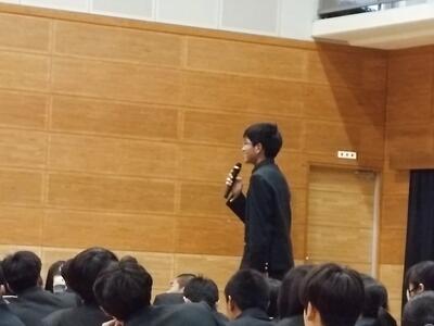 最後に、生徒会副会長の下田君から「闇バイト」の問題は、自分自身に起こることかもしれないし身近に起こる問題でもあるかもしれないので、十分に気をつけたいと謝辞がありました。まさか自分が!と考えず、起こりうるかもしれないことであると注意点の3つを忘れないことが大切ですね。(K)