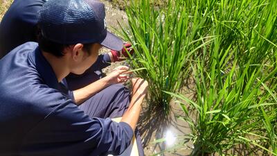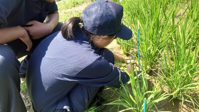 夏休みの当番実習でも、継続して調査を行ってます暑さに負けず、分げつしたイネの茎、葉を1本1本、丁寧に調査していました