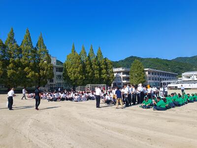 スタントマンが交通事故の状況を再現する交通安全教室が本校グラウンドで開かれました。強い日差しと34℃という気温の中だったので、日陰に入り帽子をかぶって水分補給用の水筒を片手に持ち全校生徒と芦北支援学校佐敷分教室の皆さんと参加しました。