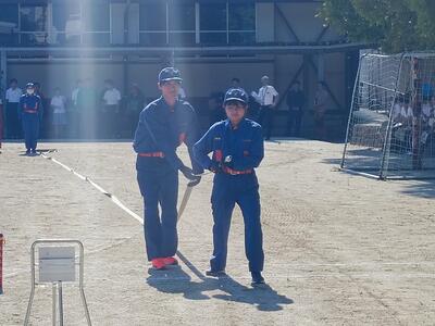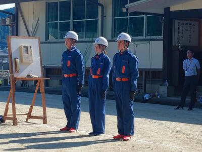 本日は、芦北町役場の消防団の方々にご協力いただき、消火訓練なども行いました。まず初めに屋内消火栓操法競技のデモンストレーションを披露していただきましたが、迅速な行動や無駄のない消火活動に日ごろからの訓練が大切であると感じました。大会でも優勝や準優勝という成績をおさめられているということも納得です!