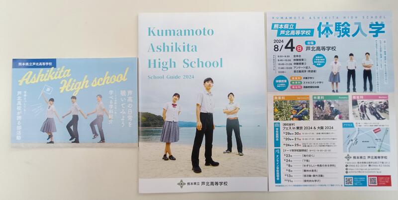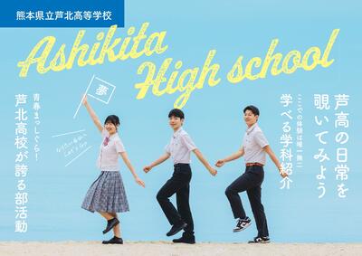 今年度の学校ガイドブック(全20ページ)、タブロイド版(A3判4つ折両面)、体験入学等ポスターができ上りました!今回は、高峰生徒会長(3F)、才藤副会長(3W)、園田副会長(3A)の3人にモデルとつとめてもらいました。実は鶴ヶ浜海水浴場で撮影で5月に撮影しました。(まだ肌寒い気候でしたが夏服で撮影)その他にも、各科の紹介や部活動など、多くの生徒にも協力してもらいました。芦北高校の魅力をできる限り詰め込んであります。