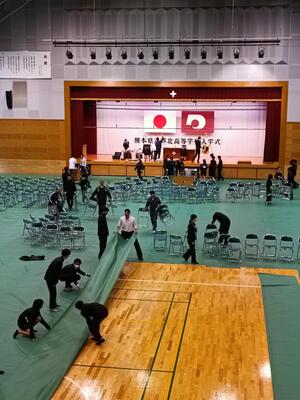 新学期が始まりました。新任式、始業式、担任等の発表を終えました。普通なら、その模様をお届けするところですが、今回は全校生徒全職員で頑張って入学式の準備しているところをお届けしたいと思います。式場の準備や教室の掃除等、新入生を迎え入れる準備を3年生2年生と先生方で行いました。天気は、あいにくの雨模様ですが、みんな協力して綺麗に整えた式場や教室になりました。