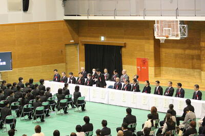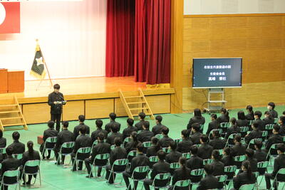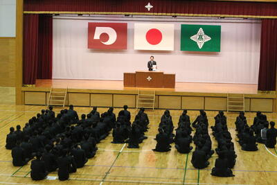 校長先生からは、本校の校訓である「敬愛(周りの人を敬い愛する心)」「勤勉(精神を集中して一心に勤める姿勢)」「創造(一から創りあげていく力)」を胸に刻むことが自身の基軸となりブレない力になる。夢を実現するには小さな歩みの積み重ねが大切である。予想しないことに不安がるのではなく、前向きにとらえる考えを持ってほしいといったことを式辞で述べられました。