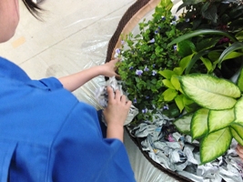 その中に花を鉢ごと配置し、新聞紙で隙間を埋めていきます。花の配置にも、さまざまな工夫があります!