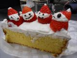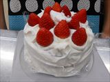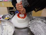 オーブンなど使い、スポンジを作り、生クリームを塗り、イチゴなどのフルーツで飾りつけを行い