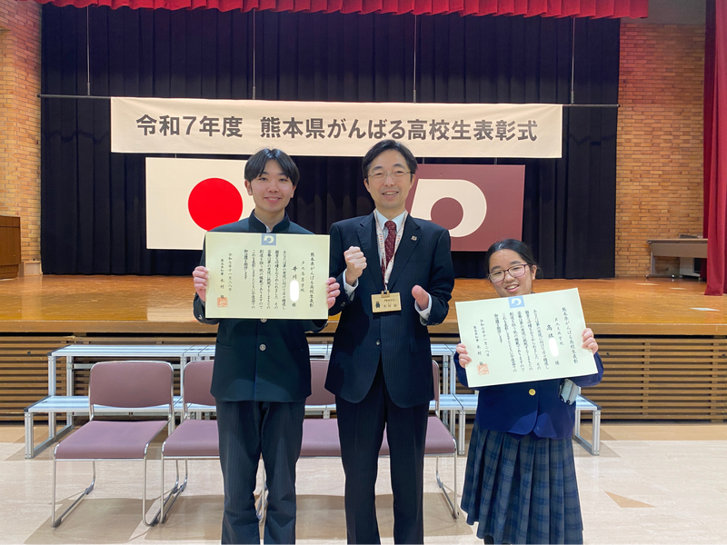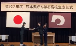 11月28日(金)、「令和7年度熊本県がんばる高校生表彰式」が熊本県庁本館地下大会議室で行われました。本校からは井川くん(福祉科3年)が受賞し、木村知事から賞状を授与されました。