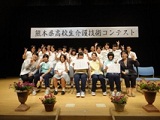 介護技術コンテスト入賞 投稿日時 : 2014/07/16 投稿者3 カテゴリ:福祉科 7月15日(火)くまもと森都心プラザにおいて、第4回熊本県高校生介護技術コンテストが開催されました。「介護技術」部門には、福祉科2年の塩坂さん(田浦中出身)、山元さん(田浦中出身)、田平さん(佐敷中出身)が参加し、見事第三位に入賞しました。「ベッドメイキング」部門には、福祉科1年の野口さん(佐敷中出身)、吉本さん(佐敷中出身)が参加し、優良賞を受賞しました。また、当日は福祉科1年生が2年生手作りの看板を手に、応援をしてくれました。生徒たちにとって非常に収穫の多い一日となりました。芦北高校の福祉科の生徒が、将来の介護現場を担ってくれる人材になることを期待します。