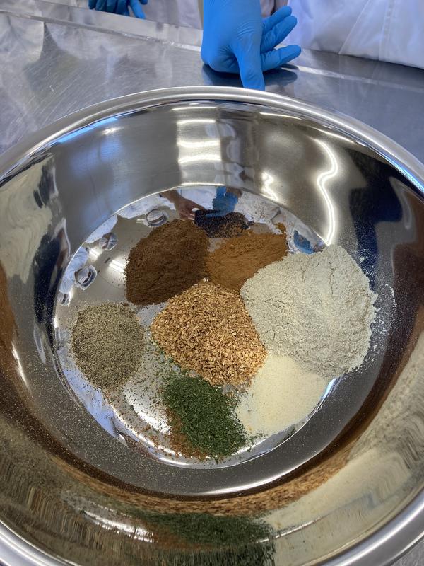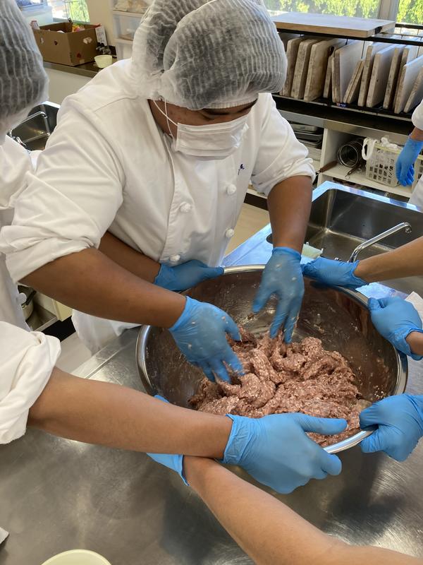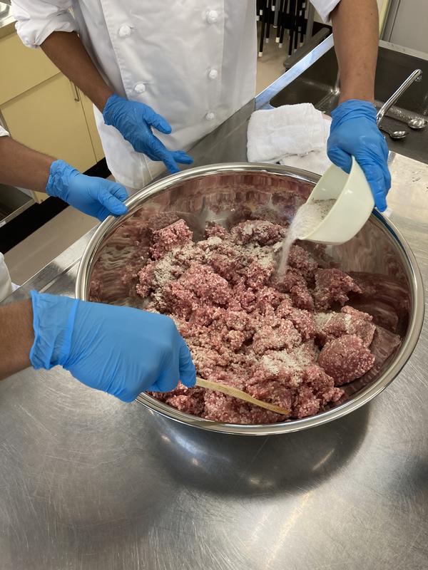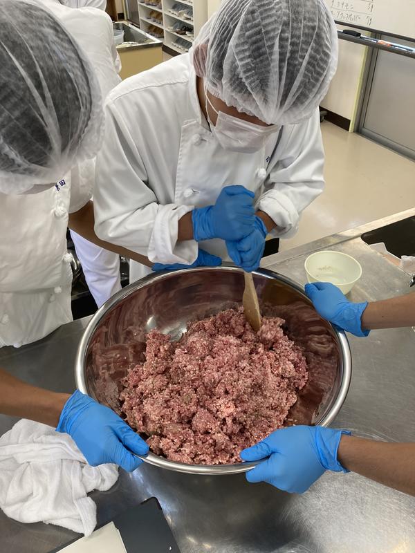 肉加工の最大のポイントは『低温をキープする』です。手で練り込むと体温が肉に伝わり、肉の温度が上がり腐敗の原因になります。なので、最初は木べらで、その後、手で素早く、しっかり混ぜなければいけません。氷水が入るので生徒は『冷たーい!』と叫んでいます。我慢です