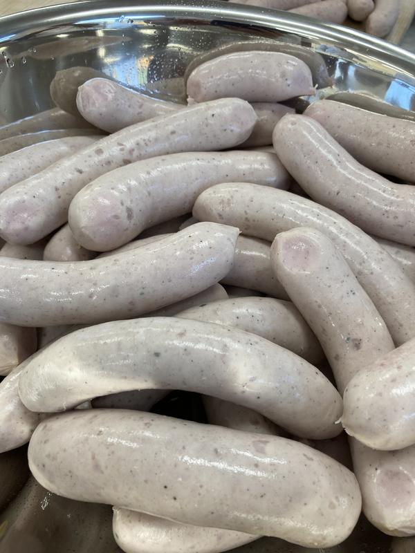 豚肉のモモ身に10%の豚脂(上脂)を加えた挽肉に、食塩、グラニュー糖、コショウやガーリック・ナツメグ等の8種のスパイス等を加えて練り込みます。そこに、氷水を加えさらに練り込んでいきます。