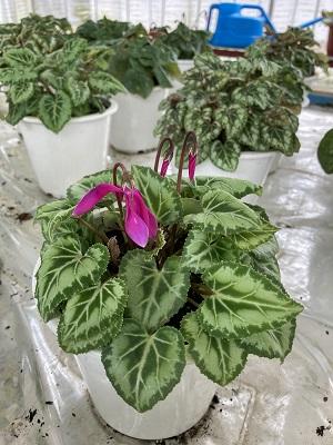 豪雨災害で多数のシクラメンは被害を受けましたが、別棟のハウスにおいていた数十鉢は元気です