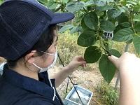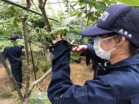 今日の実習は「太秋柿の雌花落とし」です。太秋柿は基本1本の枝に果実を1つ実らせて大玉になるように生産します。生徒たちは残す雌花以外をハサミで切り落としました