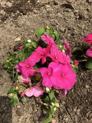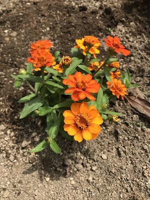 今日、植えた花苗は黄色やオレンジ色の『ジニア』と赤色やピンク色の『インパチェンス』です。