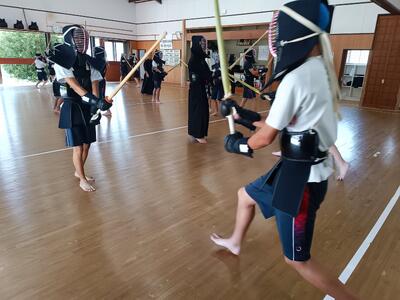 まずは素振りから!気合いを入った声で回数を数えます。体育館は少し離れたところにありますが、そこにも声がしっかりと聞こえます。足さばきの練習もここで行います。