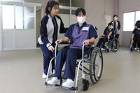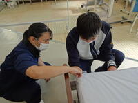 2年福祉科の生徒は4月から医療的ケア(かく痰吸引、経管栄養)の授業を受けています。10月までは座学で基礎・基本を学び、11月からは実技の練習に励んでいます。最終的には実技の試験があり、合格しなければいけません。全員合格を目指し、放課後等も利用し、お互い教え合っています。