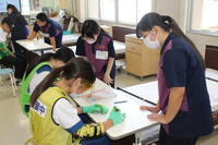 2・3日目は「救急員養成講習」を受講しました。日常生活における事故防止や三角巾を使った止血の方法や骨折などの場合の固定の方法などを学びました。また、救急搬送の方法や災害時の心得などについても学ぶことができました。生徒たちは初めて使う三角巾に四苦八苦しながらも、お互いに教え合いながら、技術を習得していきました。