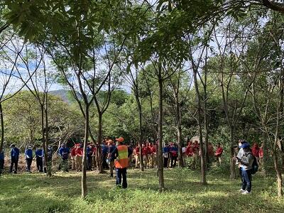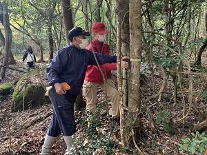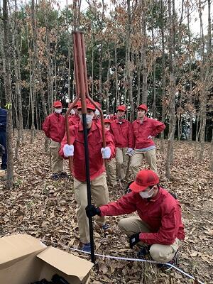 次は、実際に樹木の伐採方法について確認を行います。安全に配慮しながら決められた方向に倒すのは、とても難しいです。授業で学んでいることを実際に行うのは大変ですが、みんなしっかりと取組んでいました。