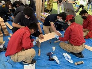 今回は、県の林務課や芦北町の建設業組合が主催となって木材利用拡大を推進するために地元の水俣高校建築科と芦北高校林業科の生徒たちで、地元材を使って、ベンチとプランターを作りました。建設業組合や工務店の方のご指導で作りましたが、みんな道具の使い方に慣れると協力して作っていました。