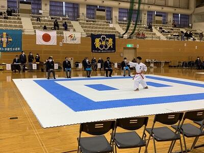 菊池市総合体育館において1.2年生大会が行われ、空手道部が参加しました。最初に個人形が行われ、上村君が参加しました。高校総体、新人戦と1位でしたが、今回は、2位という結果でした。