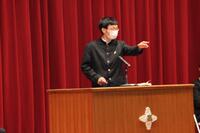 在校生総代として、生徒会長の濵田くんが送辞を述べました。在校生の代表として、各学科の先輩方が日夜努力してこられた姿に、在校生のみんなが感謝と尊敬と感銘を受けたことが述べられました。また、卒業生の希望ある飛翔を願うメッセージを向けられました。